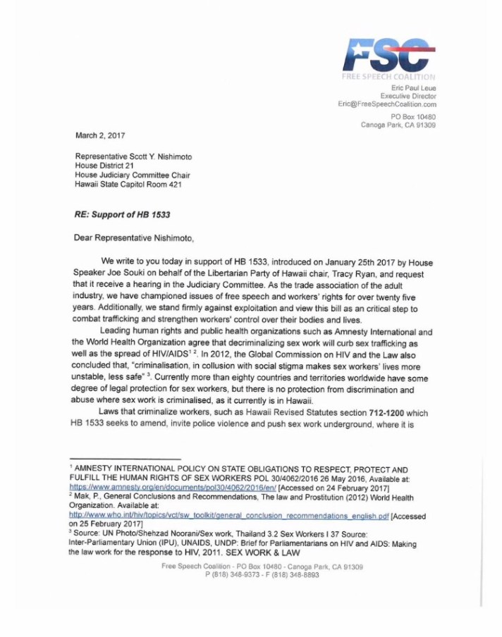 FSC Supports Hawaii Bill That Would Decriminalize Prostitution By Rhett Pardon for XBIZ dot com Mar 7, 2017 2:50 PM PST HONOLULU — The Free Speech Coalition (FSC) has given its support behind a bill in Hawaii that, if passed, would repeal penalties for consensual adult prostitution and promotion of prostitution.