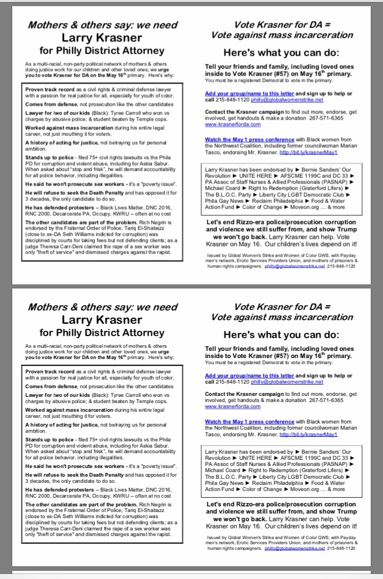 | Let’s end Rizzo-era police/prosecution corruption and violence we still suffer from, and show Trump we won’t go back. Larry Krasner can help. Vote Krasner on May 16. Our children’s lives depend on it! Issued by Global Women’s Strike and Women of Color GWS, with Payday men’s network, Erotic Services Providers Union, and mothers of prisoners & human rights campaigners.