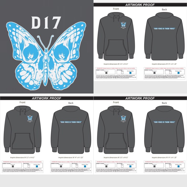 Artwork this year has been contributed by MimiArtz Lancaster County and Johnny Robinson Wayne County, informatics donated by local Philadelphia volunteers, imagery by ClickSavePhoto Kensington, and Flocco’s Family Clothing Of Conshohocken helped design hoodies donated to volunteers and survivors. The blue butterfly representing hope emerging free from death is also in memory of Rickie Jolene. Eagles T-shirts’ from Flocco’s will also be gifted to attendees traveling in to Philly.