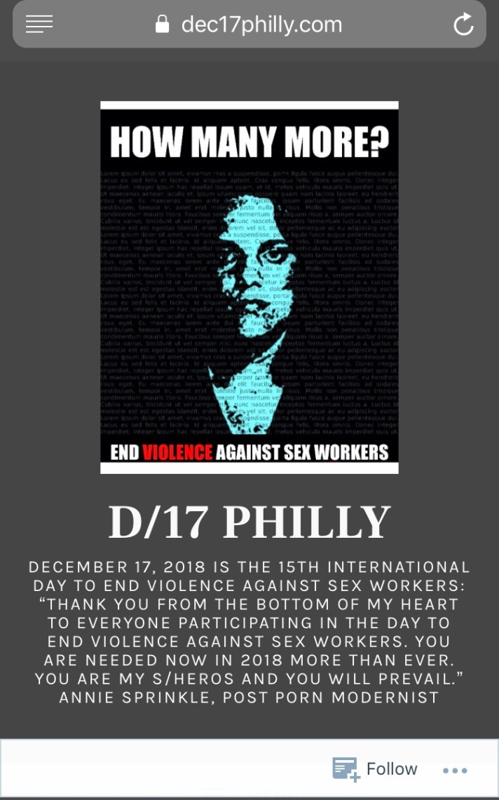 One of the original founders of the event is from Philadelphia, offering: “Thank you from the bottom of my heart to everyone participating in the Day to End Violence Against Sex Workers. You are needed now in 2018 more than ever. You are my s/heros and you will prevail.” Annie Sprinkle, Post Porn Modernist.