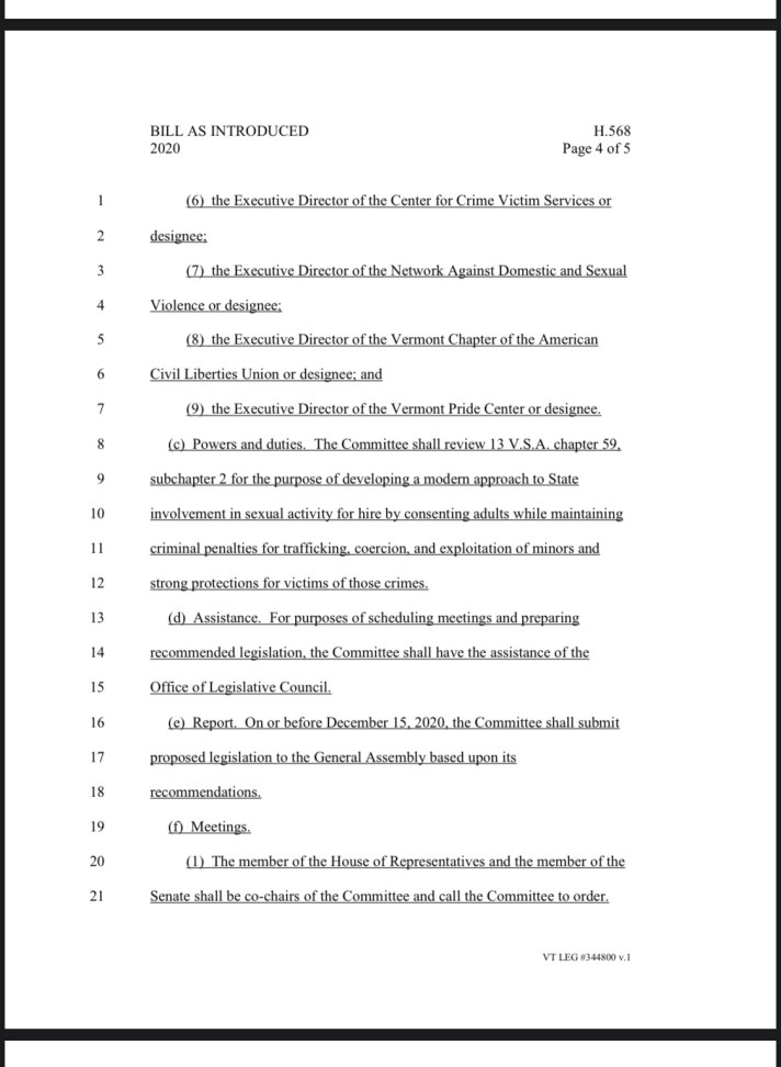 Our annual state legislative session began last week, and a State Representative named Selene Colburn Progressive Party/ Burlington (SColburn@leg.state.vt.us)has introduced a bill to “protect sex workers from the risks inherent in the illicit profession” Vermont House Bill H.569