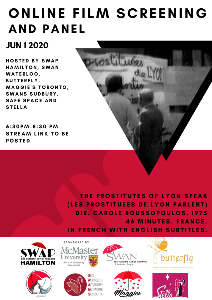 This event is co hosted by: SWAP – Sex Workers’ Action Program Hamilton, SWAN Waterloo – Sex Workers’ Action Network of Waterloo Region, Butterfly: Asian and migrant sex workers support network, Maggie’s: Toronto Sex Workers Action Project, Sex Workers Advisory Network Sudbury – SWANS, SafeSpace London, and Les ami(es) de Stella. It is sponsored by the McMaster Office of Community Engagement, and the Women & HIV/AIDS Initiative (WHAI).